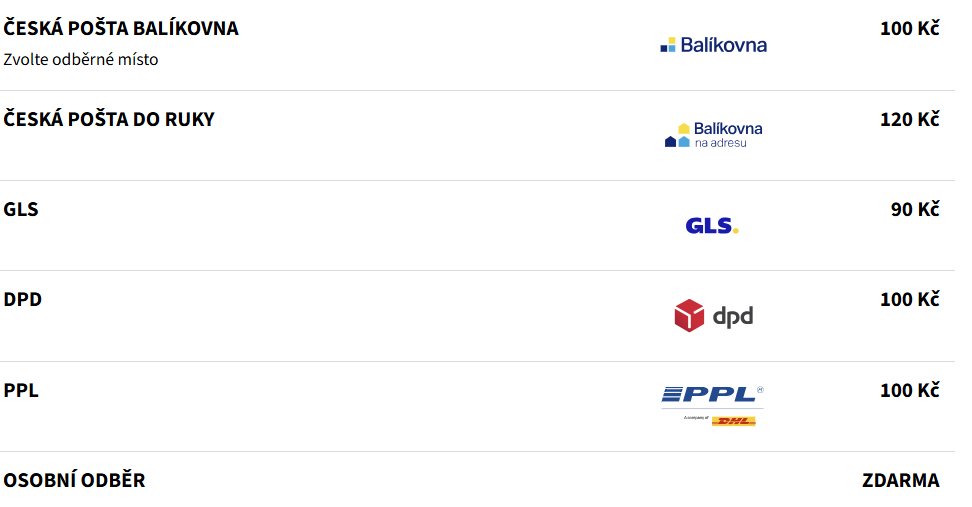 Ceník Cena dopravy:Osobní odběr možný na adresách:• Dvůr Králové nad Labem - Dukelská 2266• Česká Skalice - Zlíč 20